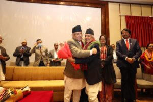 रामचन्द्र पौडेललाई अँगालो बाँधेर प्रचण्डले दिए बधाई
