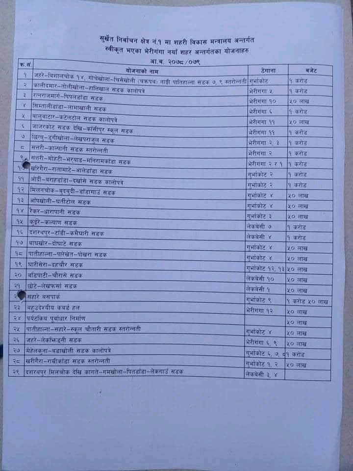 यस्तै, सत्तरी काल्पानी सडक स्तरोन्नती गर्न १ करोड, सहारे वसपार्कका लागि १ करोड ५० लाख, कुईरे कल्याण सडकका लागि १ करोड, रैकर धारापानी सडकका लागि ५० लाख विनियोजन गरिएको छ।