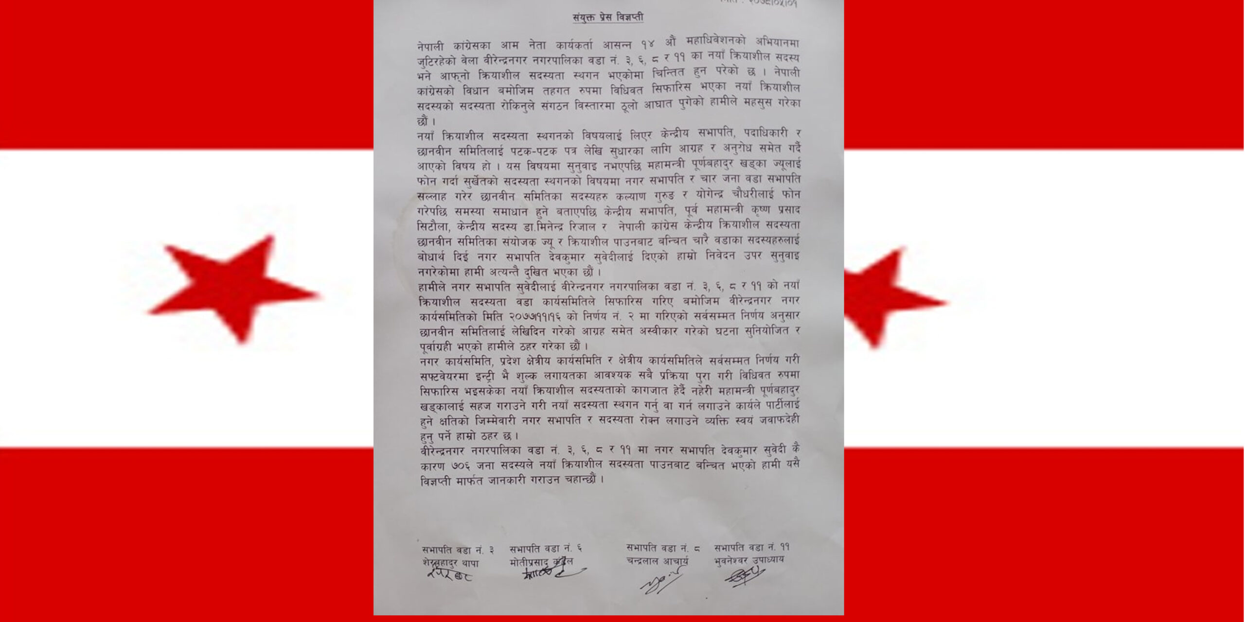 चार वटा वडाका सभापतिहरु शेरबहादुर थापा, मोतिप्रसाद कँडेल, चन्द्रलाल आचार्य र भुवनेश्वर उपाध्यायले मंगलवार संयुक्त विज्ञप्ति जारी गरी काँग्रेस वीरेन्द्रनगर नगर सभापति सुवेदीका कारण यी चार वडाका ७ सय ६ जना सदस्यहरुले नयाँ क्रियाशील सदस्यता पाउनबाट बञ्चित भएको जनाएका हुन्।