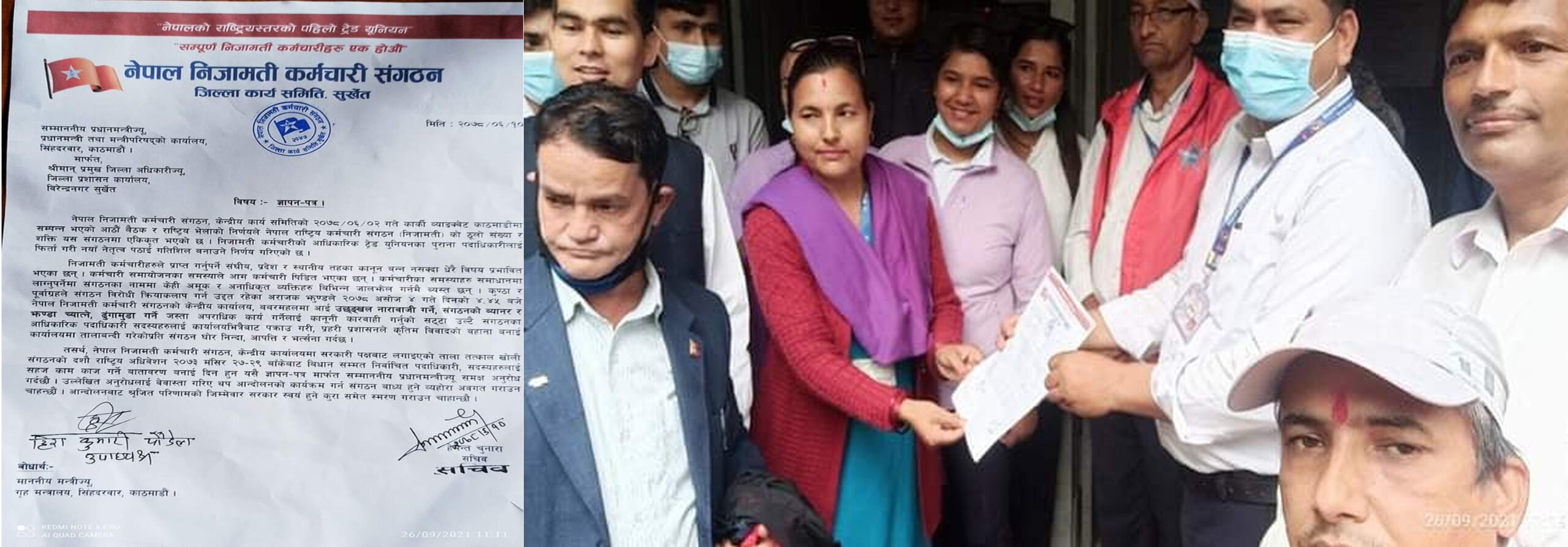 नेपाल निजामती कर्मचारी संगठनको केन्द्रीय कार्यालयमा नेपाल सरकारबाट तालाबन्दी गरिएको भन्दै विरोध जनाएको छ। प्रधानमन्त्री शेरवहादुर देउवालाई आईतवार जिल्ला प्रशासन कार्यालय सुर्खेतमार्फत उक्त ज्ञापनपत्र वुझाईएको छ।