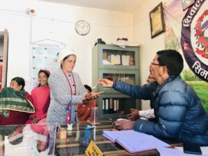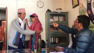 सुर्खेत । जाजरकोटको शिवालय गाउँपालिकाका अध्यक्ष शेरबहादुर शाही पालिका कार्यालयमा आएका सेवाग्राहीसहितलाई भारतको उत्तरप्रदेशस्थित प्रयागराज कुम्भ मेलादेखि ल्याएको जल (पानी) खुवाउँदै । तस्बिर : कुलेन्द्र शाही