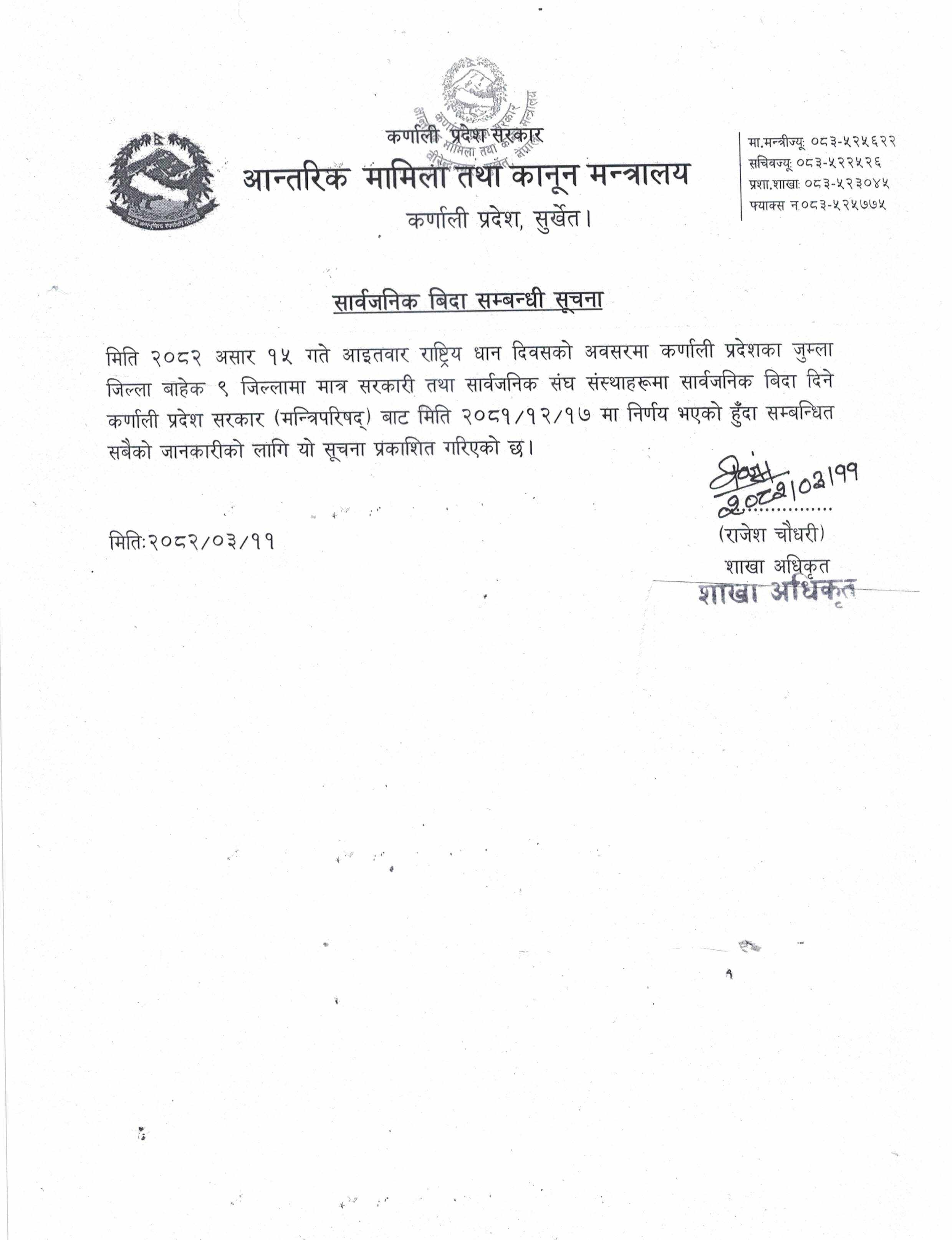 सुर्खेत । कर्णाली प्रदेश सरकारले असार १५ गते सार्वजनिक बिदा दिने निर्णय गरेको छ । राष्ट्रिय धान दिवसको अवसरमा असार १५ गते कर्णाली प्रदेशका १० जिल्लामध्ये जुम्लाबाहेक सबै जिल्लामा सार्वजनिक बिदा दिने निर्णय गरेको आन्तरिक मामिला तथा कानुन मन्त्रालयले जनाएको छ ।