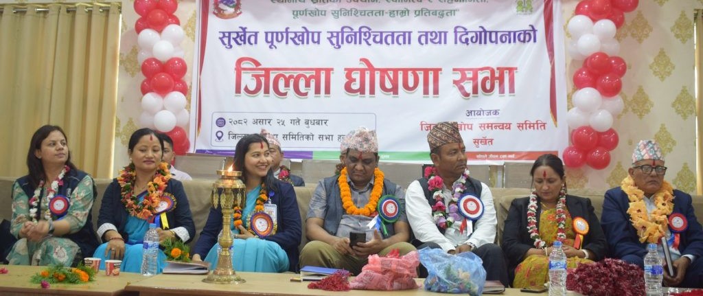 सुर्खेत । सुर्खेत जिल्लालाई पूर्ण खोप सुनिश्चितता तथा दिगोपना जिल्ला घोषणा गरिएको छ । जिल्ला समन्वय समिति सुर्खेतले बुधवार वीरेन्द्रनगरमा आयोजना गरेको सभामार्फत् ‘सुर्खेतलाई पूर्ण खोप सुनिश्चितता तथा दिगोपना जिल्ला घोषणा’ गरेकाे हाे । सो अवसरमा कर्णाली प्रदेश सरकारका सामाजिक विकासमन्त्री घनश्याम भण्डारीले सुर्खेत पूर्ण खोप सुनिश्चितता तथा दिगोपनाको जिल्ला घोषणा भएकाेप्रति बधाई ज्ञापन गर्दै यसको निरन्तरतामा जोड दिन आग्रह गरे ।