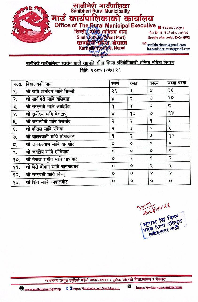 भलिबलतर्फ छात्र समूहमा सानीभेरी मावि बलिबाङ र छात्रा समूहमा जनज्योति मावि मेलचौ प्रथम भएकाे अधिकृत बिष्टले जानकारी दिए । छात्र–छात्रा दुबै समूहमा १ सय मिटरदेखि ३ हजार मिटरसम्मका दौड, रिले, हाइजम्प, लङजम्प, त्रिपलजम्प, ज्याभलिङ थ्रो, सटफुट, तेक्वान्दो र एकल पुम्सेमा प्रतिस्पर्धा भएको थियो । विजेता खेलाडीहरूलाई पदक, प्रमाणपत्र र पुरस्कार प्रदान गरिएको सानीभेरी गाउँपालिकाले जनाएको छ ।