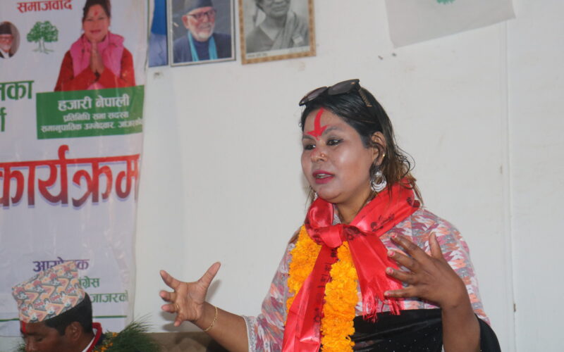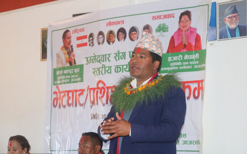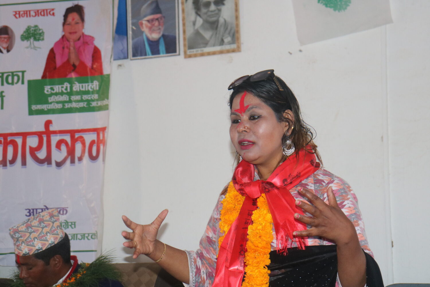 जाजरकोट । नेपाली कांग्रेस जाजरकोटका समानुपातिक उम्मेदवार हजारी नेपालीले दलित र युवालाई समावेश गरेर नेपाली कांग्रेसले वास्तविक परिवर्तनको खोजी गरेको बताएकी छन्। शनिवार नेपाली कांग्रेस जाजरकोटले खलंगामा आयोजना गरेको उम्मेदवारसँग पालिकास्तरीय कार्यकर्ता भेटघाट तथा प्रशिक्षण कार्यक्रममा बोल्दै उनले कांग्रेसले दलित र युवाहरूलाई नेतृत्वमा ल्याएर जिल्लामा नयाँ सोच र ऊर्जा भित्र्याउन खोजेको दाबी गरेकी हुन्।