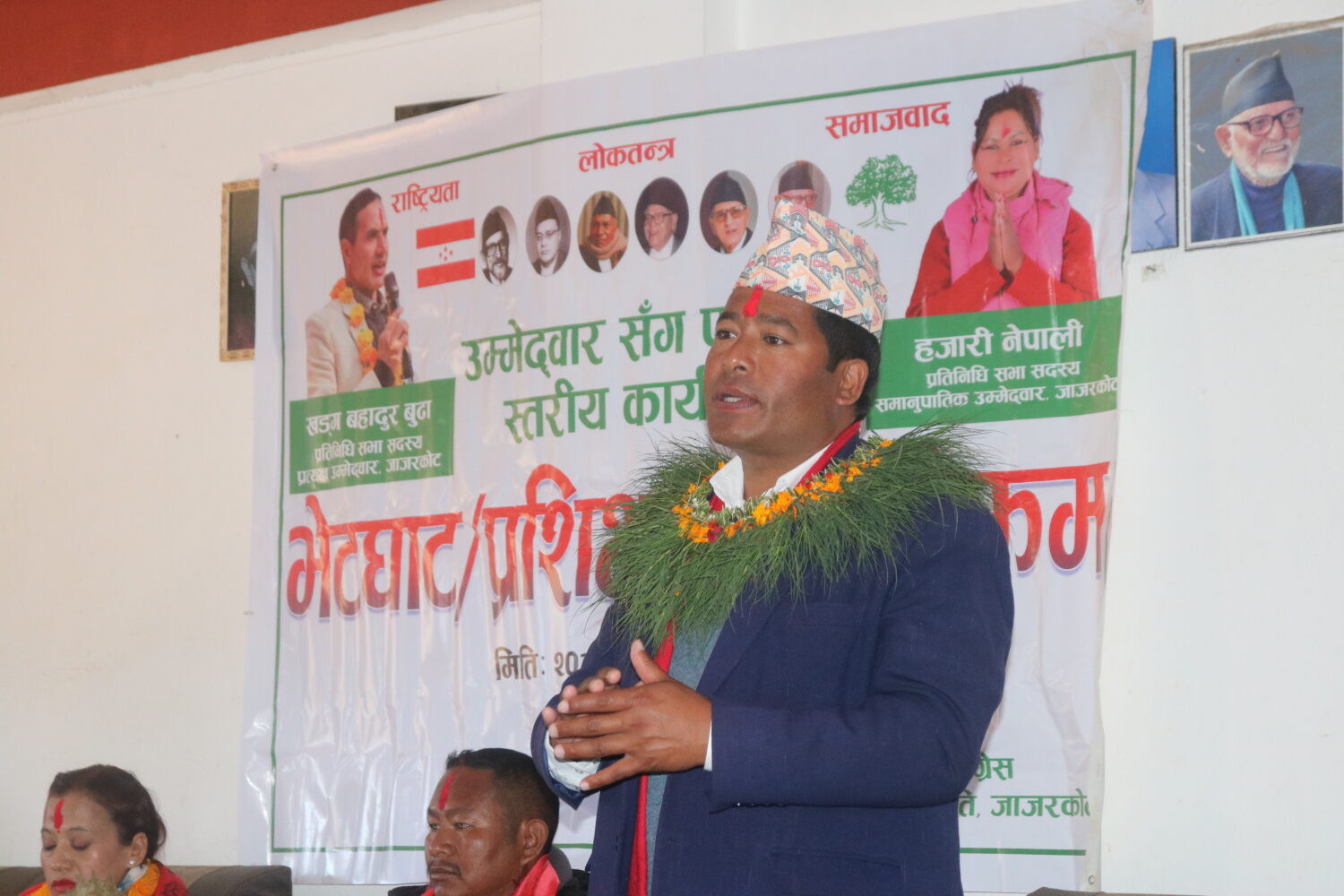 जाजरकोट । नेपाली कांग्रेस जाजरकोटका सभापति तथा कर्णाली प्रदेशसभा सदस्य बेदराज सिंहले जाजरकोटका मतदाताहरूले सामान्य परिवारबाट आएका खडक बुढालाई जबर्जस्त जिताउन खोजेको बताएका छन्। शनिवार नेपाली कांग्रेस जाजरकोटले खलंगामा आयोजना गरेको उम्मेदवारसँग पालिकास्तरीय कार्यकर्ता भेटघाट तथा प्रशिक्षण कार्यक्रममा बोल्दै उनले जाजरकोटमा यसपटक कांग्रेसको जित सुनिश्चित बताएका हुन्।