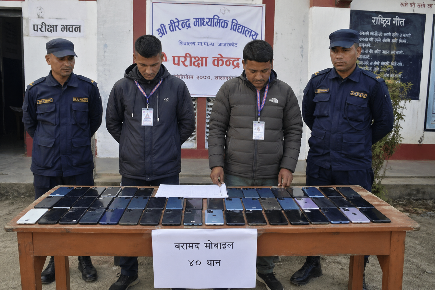 सुर्खेत। कक्षा १२ को परीक्षामा जाजरकोटका दुई वटा परीक्षा केन्द्रबाट परीक्षार्थीहरूको साथबाट ४० थान मोबाइल बरामद गरिएको छ। आज (सोमवार) देखि सुरु भएको कक्षा १२ को परीक्षाका क्रममा जिल्लाको शिवालय गाउँपालिका–७ स्थित वीरेन्द्र माध्यमिक विद्यालय परीक्षा केन्द्र र शिवालय गाउँपालिका–३ स्थित सरस्वती माध्यमिक विद्यालय सिमा परीक्षा केन्द्रबाट ती मोबाइल बरामद गरिएको हो।