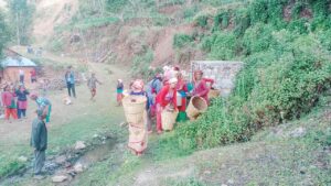 सयौँ डोका, बोतल, गाग्री र त्यत्तिकै मान्छेको भिड सबै त्यहाँ पानी ल्याउन गएका थिए । गाउँभन्दा धेरै टाढा डोप्केबाट बोकेर पानी ल्याउनु पर्ने हुँदा उनीहरू बिहानै घरबाट लाइन लागेर धारामा पुग्दा रहेछन् । दुई घण्टा हिँडेर धारामा आए पनि त्यहाँ उनीहरूले पालो कुर्नुपर्छ । प्रशस्तै पानी पनि पाउँदैनन् । गाउँभन्दा करिब दुई घण्टा हिँडेर पल्लो गाउँमा पानी लिन जानु उनीहरूको दैनिकी नै बनेको छ ।