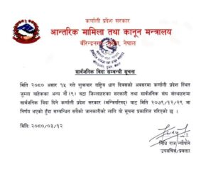 सुर्खेत । कर्णाली प्रदेश सरकारले १५ असारमा सार्वजनिक बिदा दिने निर्णय गरेको छ । राष्ट्रिय धान दिवसको अवसरमा १५ असारमा कर्णाली प्रदेशका १० वटा जिल्ला मध्ये जुम्ला बाहेक सबै जिल्लामा सार्वजनिक बिदा दिने निर्णय गरेको आन्तरिक मामिला तथा कानुन मन्त्रालयले जनाएको छ ।