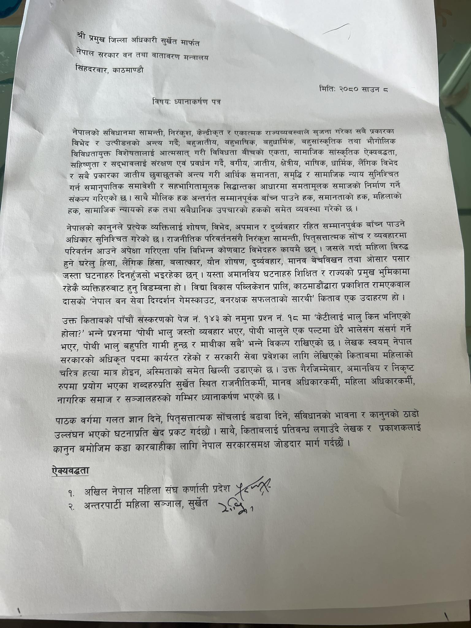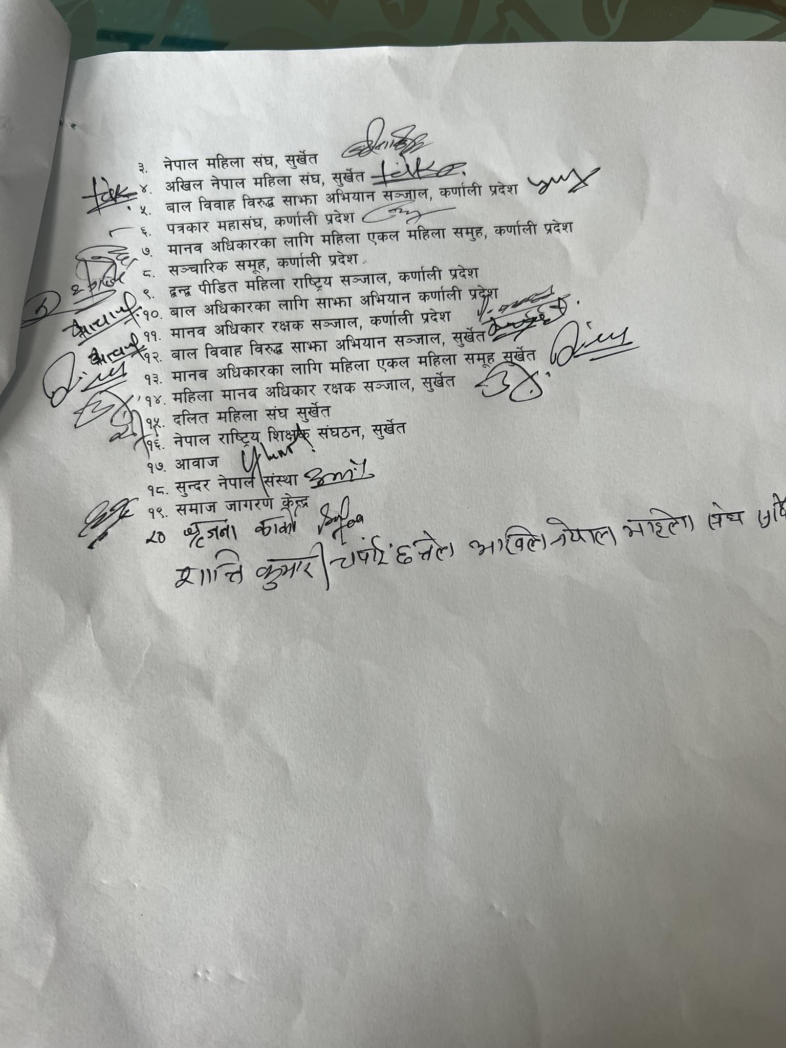 ध्यानकर्षण पत्र दिनेहरुमा अखिल नेपाल महिला संघ कर्णाली, अन्तरपार्टी महिला सञ्जाल सुर्खेत, नेपाल महिला संघ, अखिल नेपाल महिला संघ सुर्खेत, बाल विवाह विरुद्ध साझा अभियान सञ्जाल कर्णाली प्रदेश, सञ्चारिका समुह कर्णाली प्रदेश, नेपाल पत्रकार महासंघ कर्णाली प्रदेश, लगाएत २० वटा सञ्जाल, संस्था र समुहहरु रहेका छन् ।