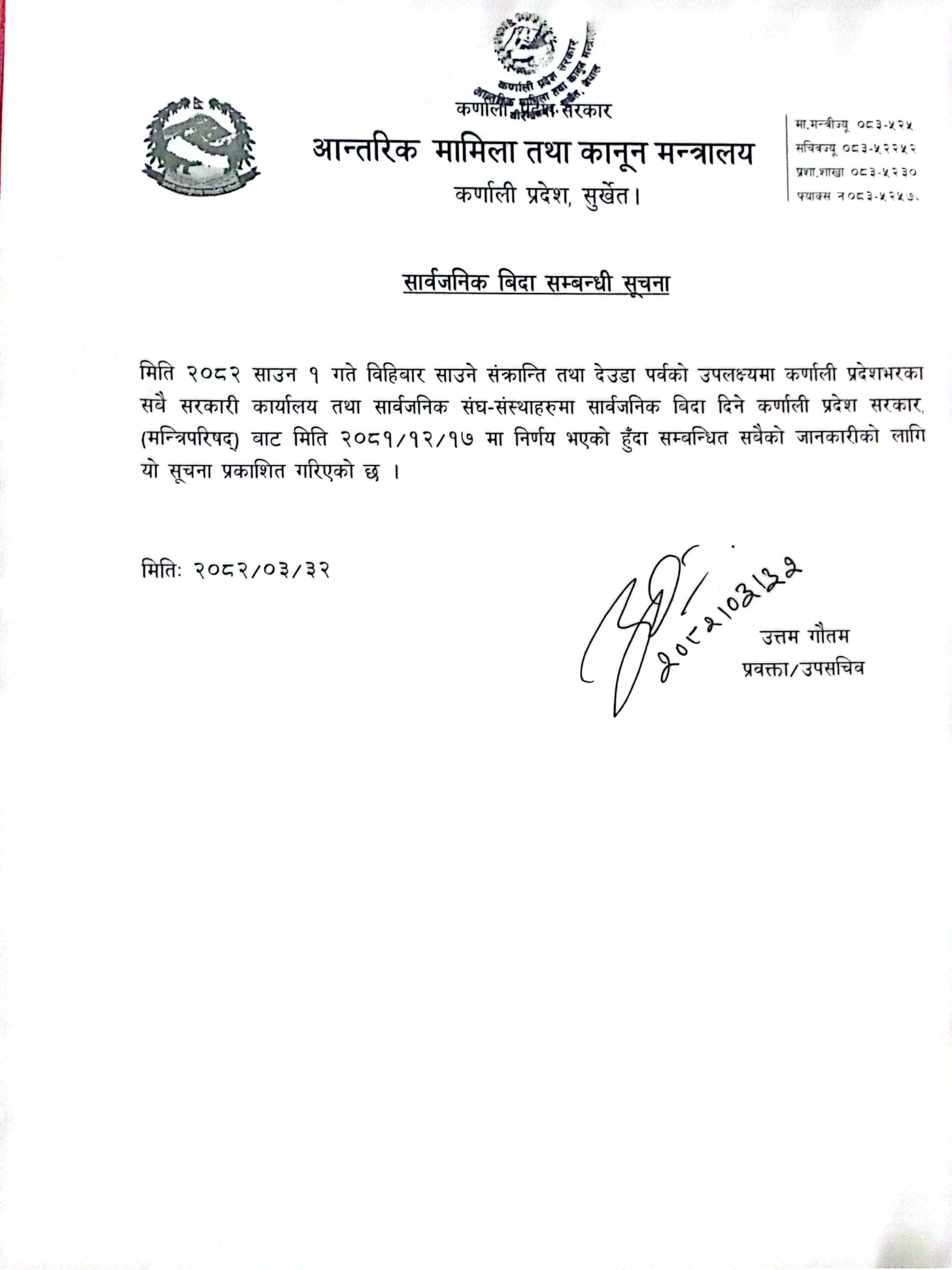 गत चैत १७ गते बसेको कर्णाली प्रदेश सरकार (मन्त्रिपरिषद्) काे बैठकले साउन १ गते सार्वजनिक बिदा दिने निर्णय गरेको थियो। सोही निर्णयअनुसार भोलि प्रदेशका सबै सरकारी तथा सार्वजनिक सङ्घसंस्थामा बिदा दिइने आन्तरिक मामिला तथा कानुन मन्त्रालयका प्रवक्ता तथा उपसचिव उत्तम गौतमले जानकारी दिए।