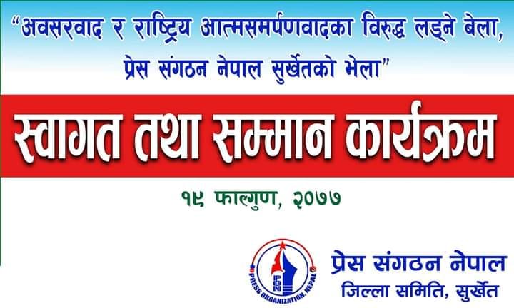 प्रेस संगठन सुर्खेतका संयोजक दिपेन्द्र ओलीको अध्यक्षतामा भएको भेलाको संचालन उक्त संगठनका जिल्ला सह(संयोजक गोविन्द खत्रीले गरेका थिए भने स्वागत संवोधन सुर्खेत जिल्ला सह- संयोजक सीता ओलीले गरेकी थिईन।