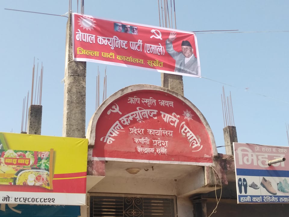 नेकपा एमाले सुर्खेतले आजदेखि जिल्ला पार्टी कार्यालय संचालन गरेको छ। सर्वोच्च अदालतले नेपाल कम्युनिस्ट पार्टी (नेकपा) को एकीकरणलाई अवैध ठहर गरेपछि नेकपा एमालेले आफ्नो कार्यालय खोलेको हो।
