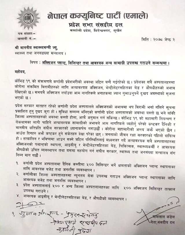 नेपाल कम्युनिस्ट पार्टी (एमाले) कर्णाली प्रदेश सभा संसदीय दलले कोरोना महामारीले कर्णाली प्रदेशभरिको अवस्था जटिल वन्दै गैरहेको भन्दै अक्सिजन लगायतका स्वास्थ्य सामाग्रीहरु तत्काल उपलब्ध गराईदिन संघीय सरकार समक्ष माग गरेको छ।